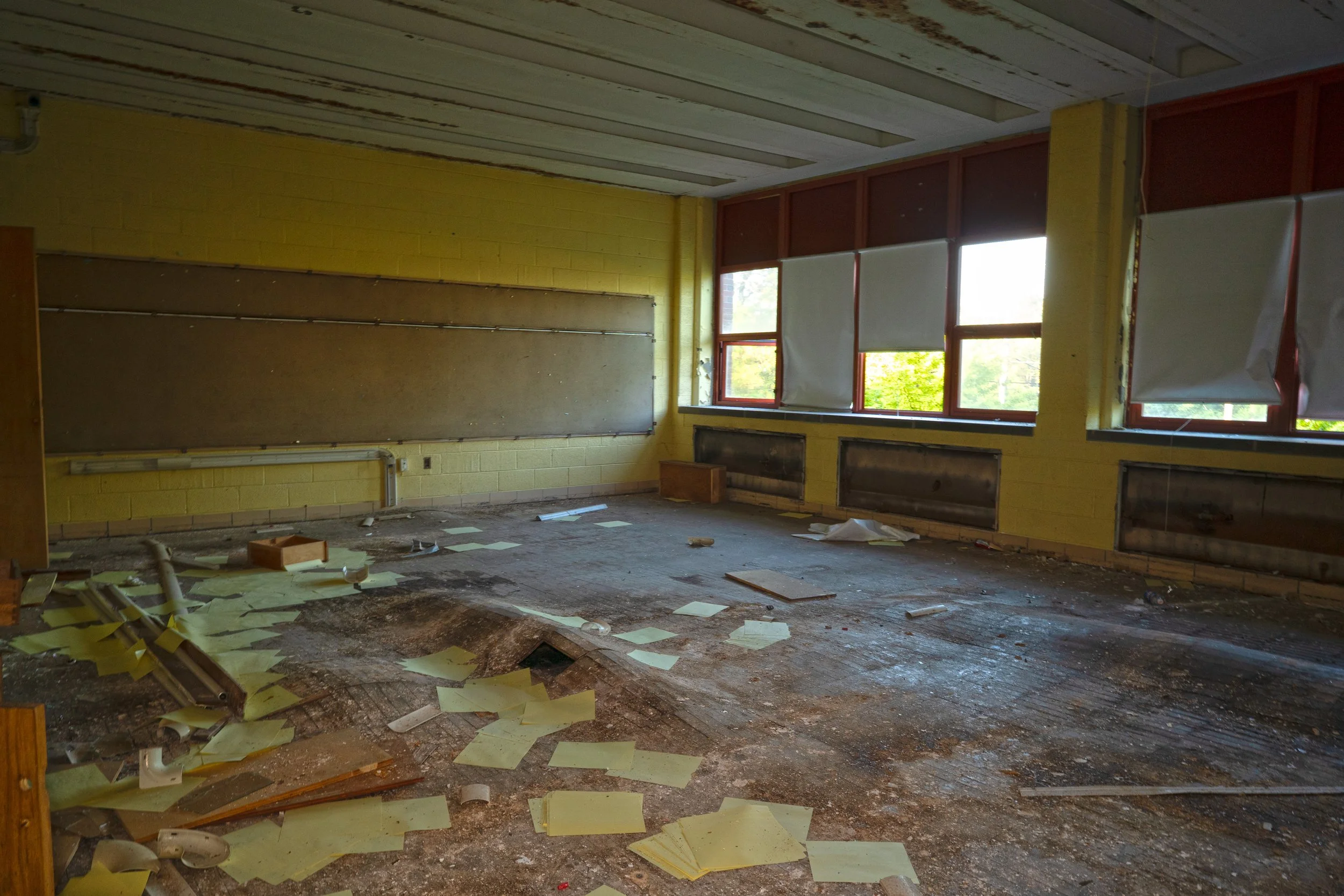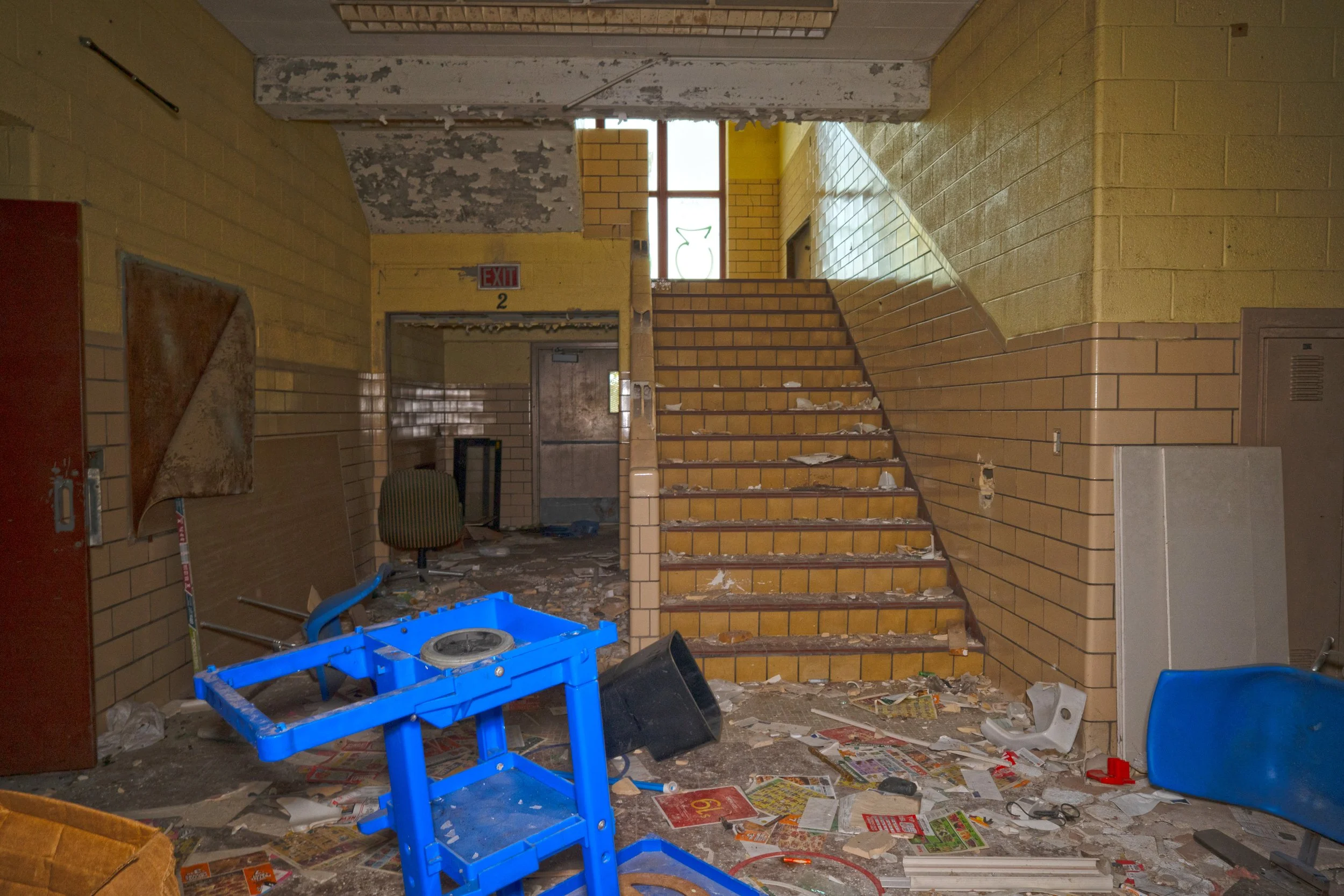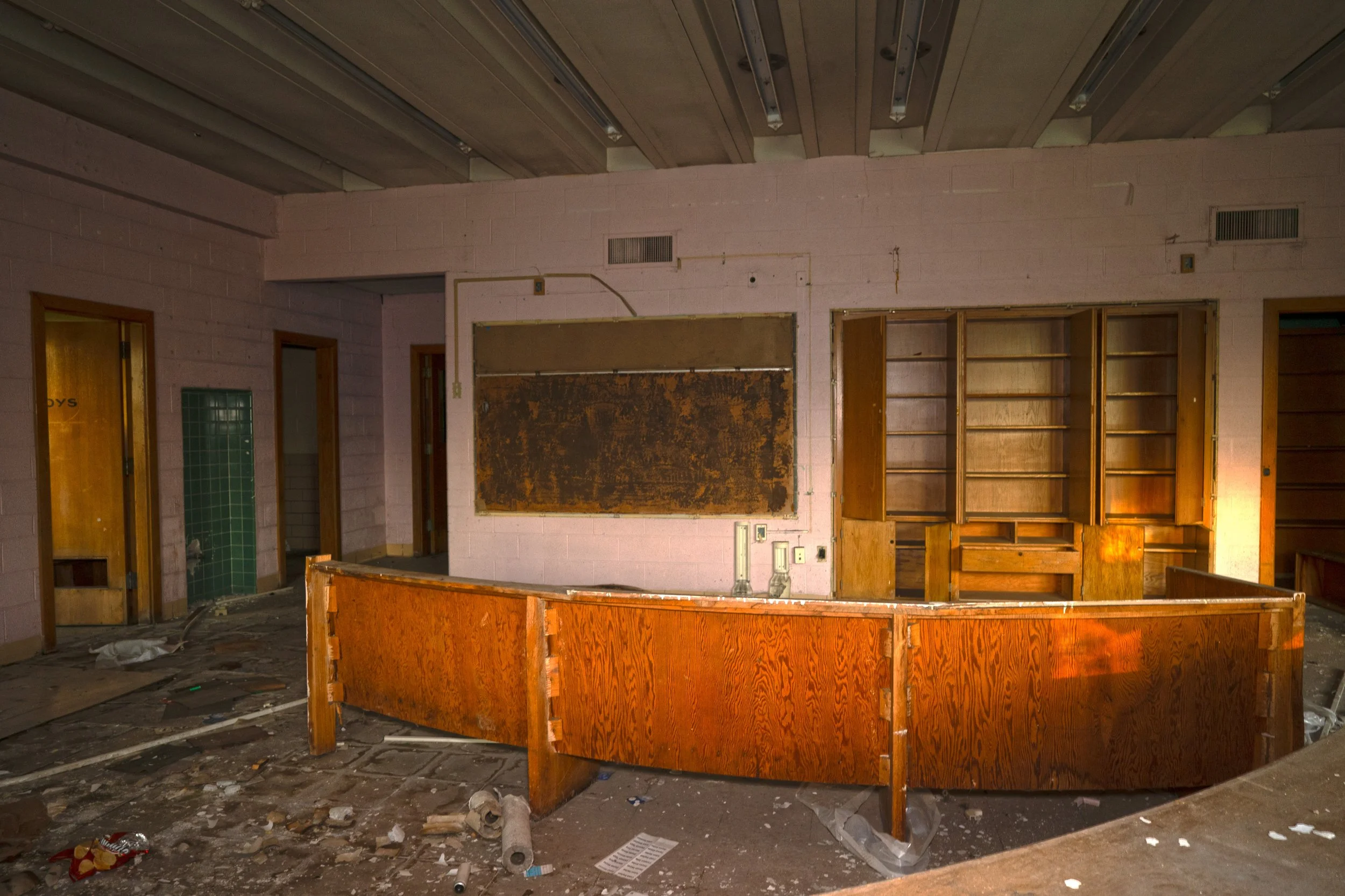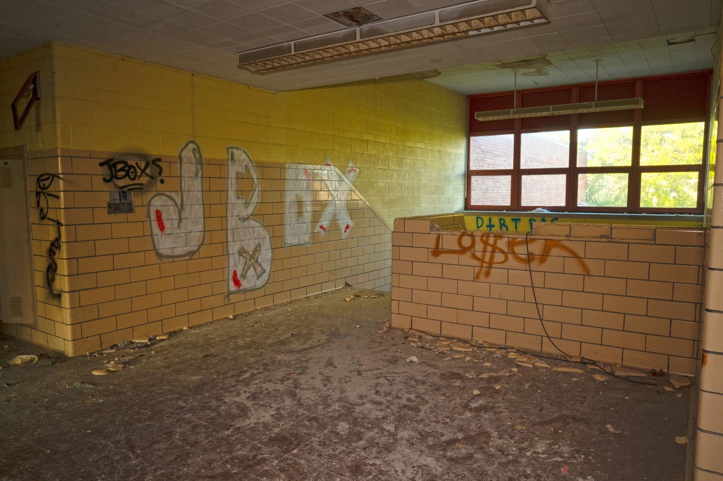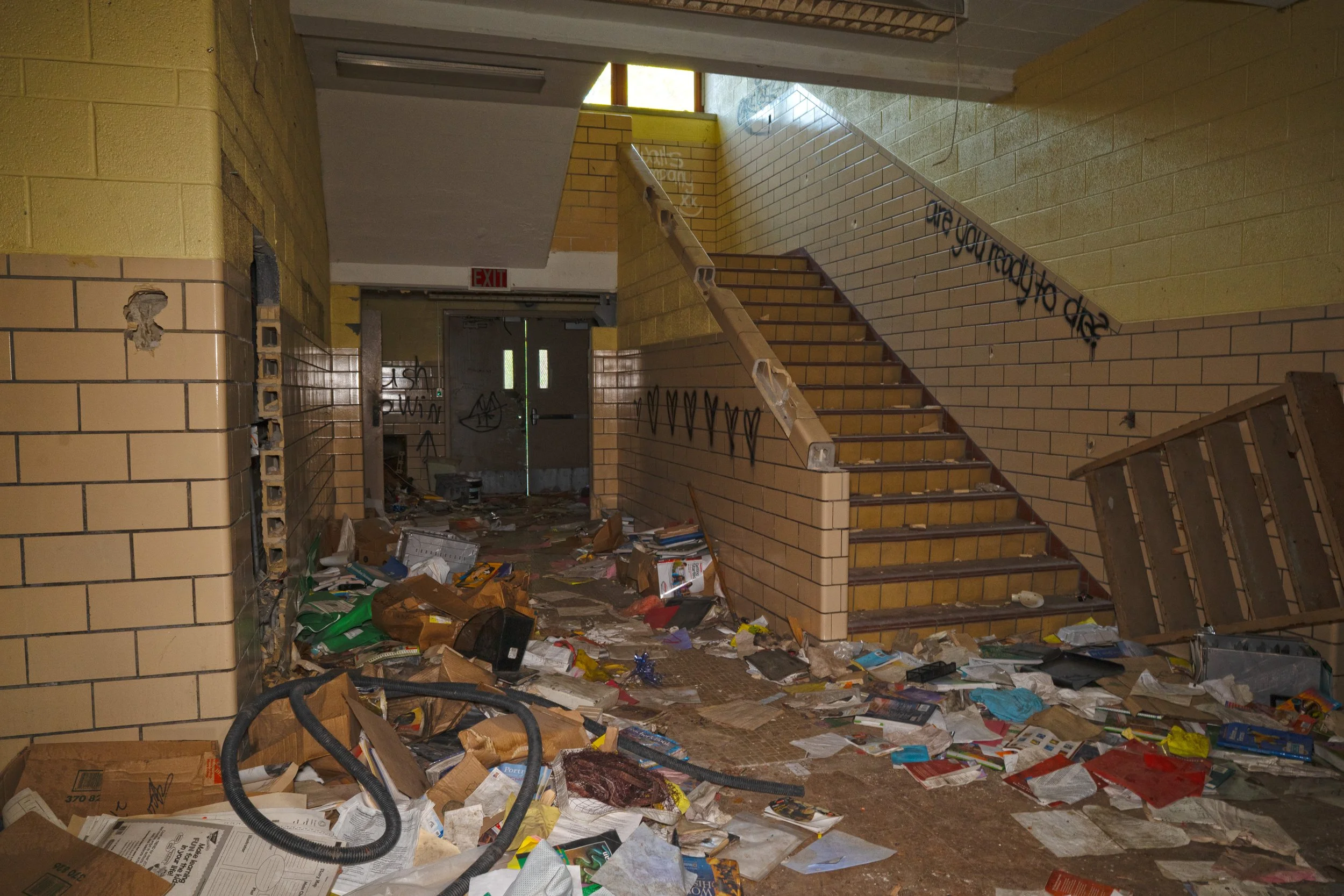 Bunche was a very unique twist of CMU, while many Detroit schools built in the 1950s or with additions in the 50s have boring painted concrete brick designs. Bunche somehow puts a interesting twist into its architectural style. From the curves to the layout of the school it is very unique, also of note is the inclusion of two separate kindergarten rooms both completed with bay windows. Bunche will also be remembered by me for its abundance of papers and textbooks just laid all over the floor everywhere. Along with this the one school in Detroit I have seen with a library still having books or other media inside, the other thing of note would be the desks still semi lined up in many classrooms.