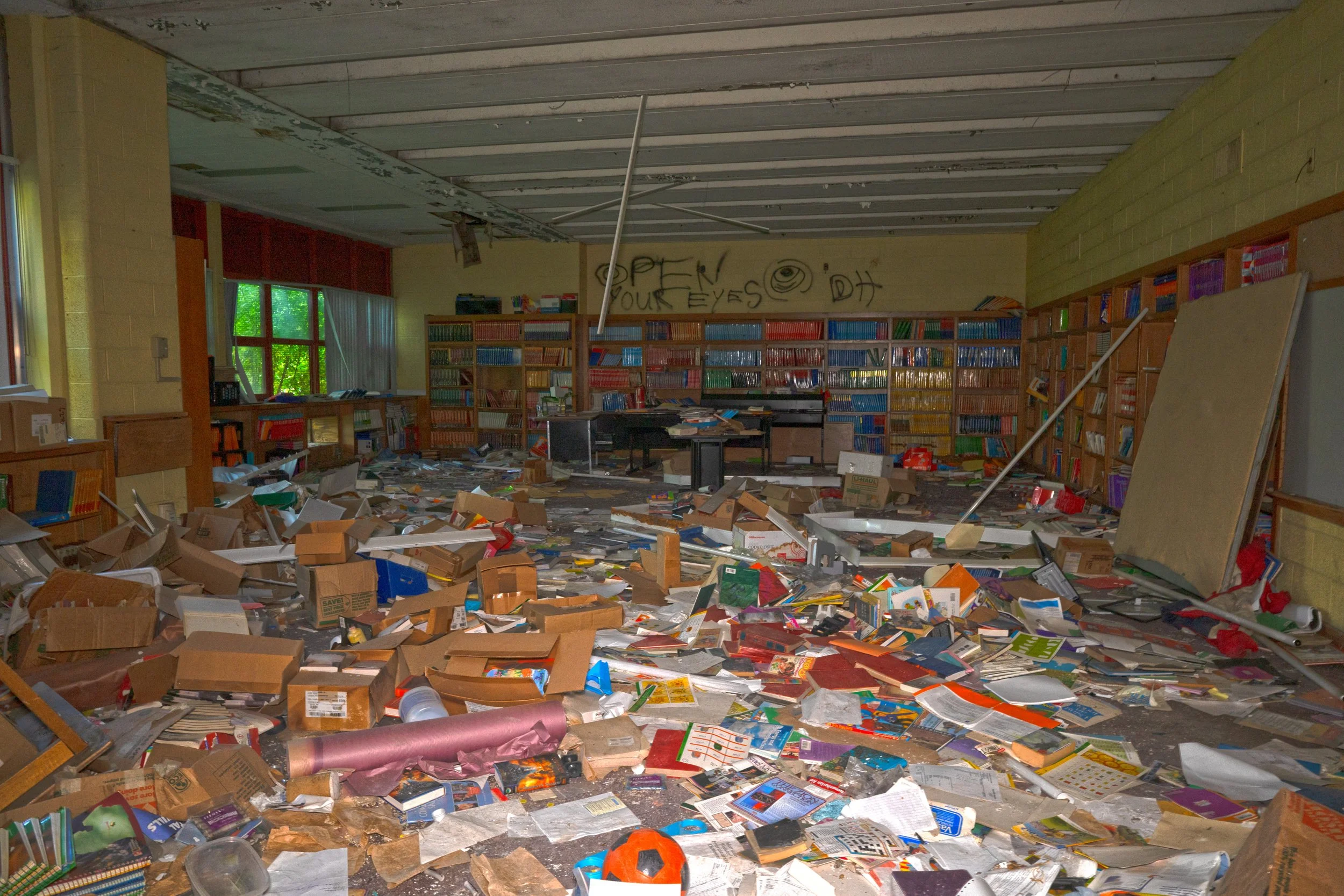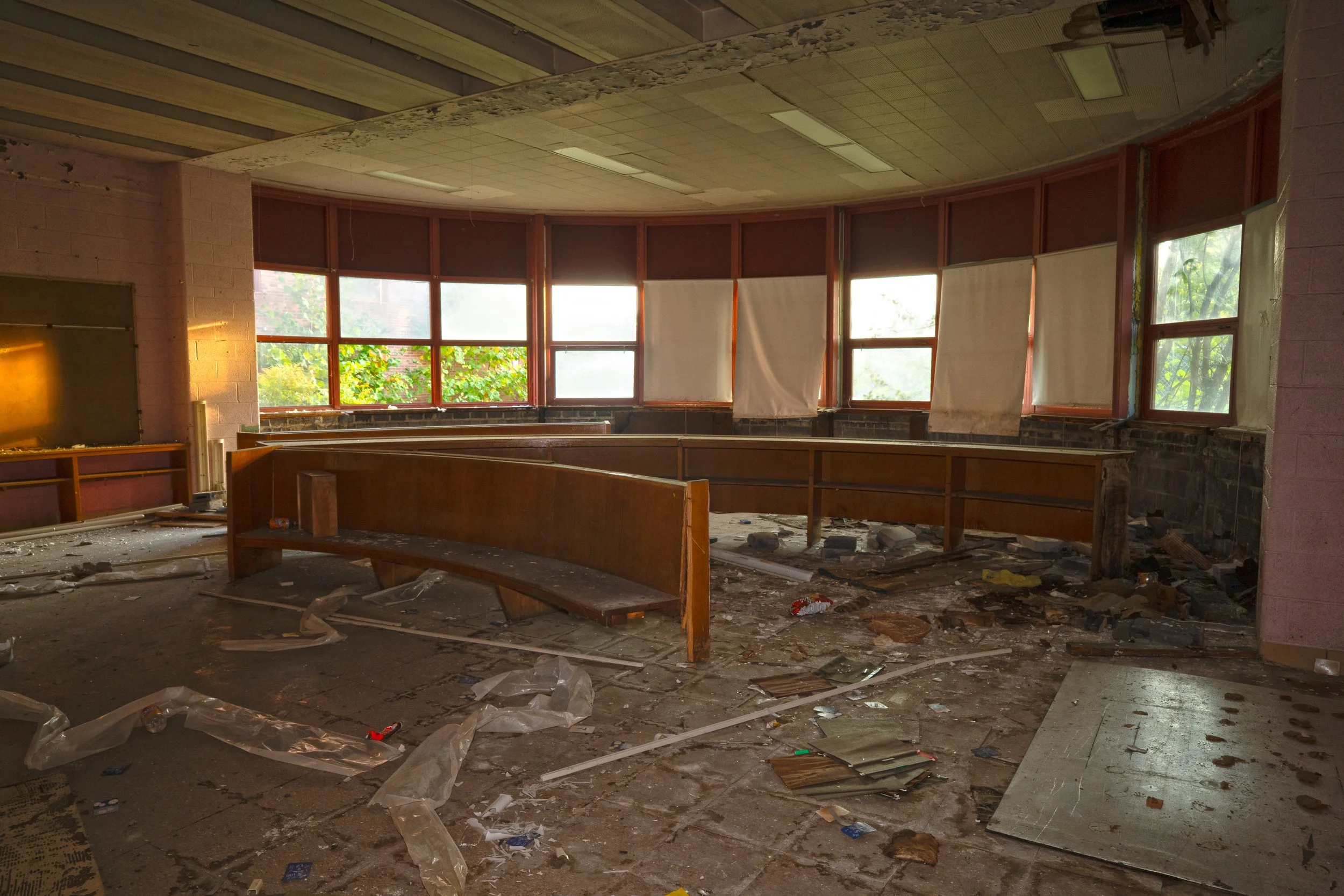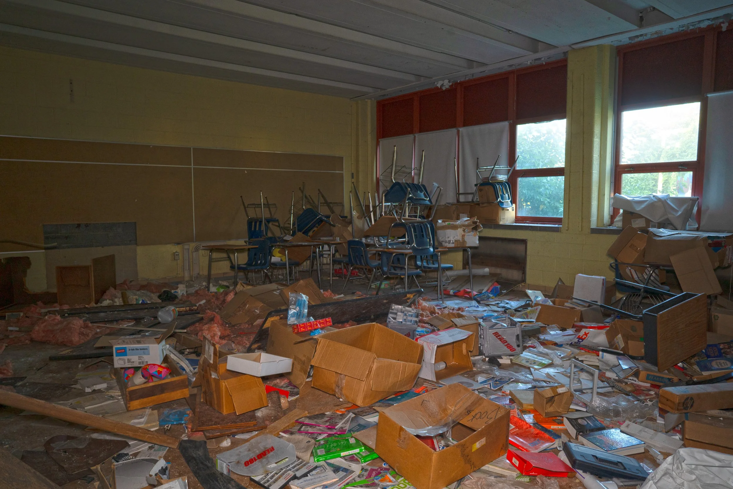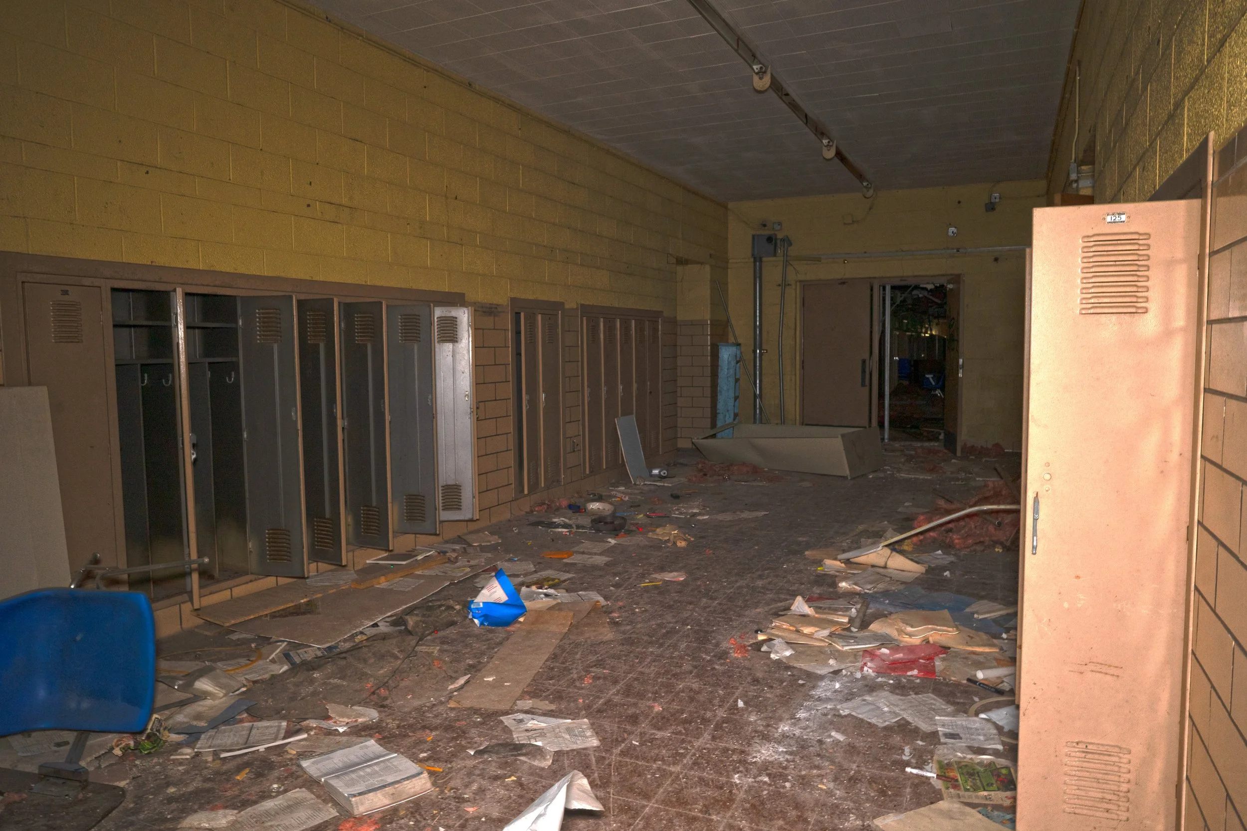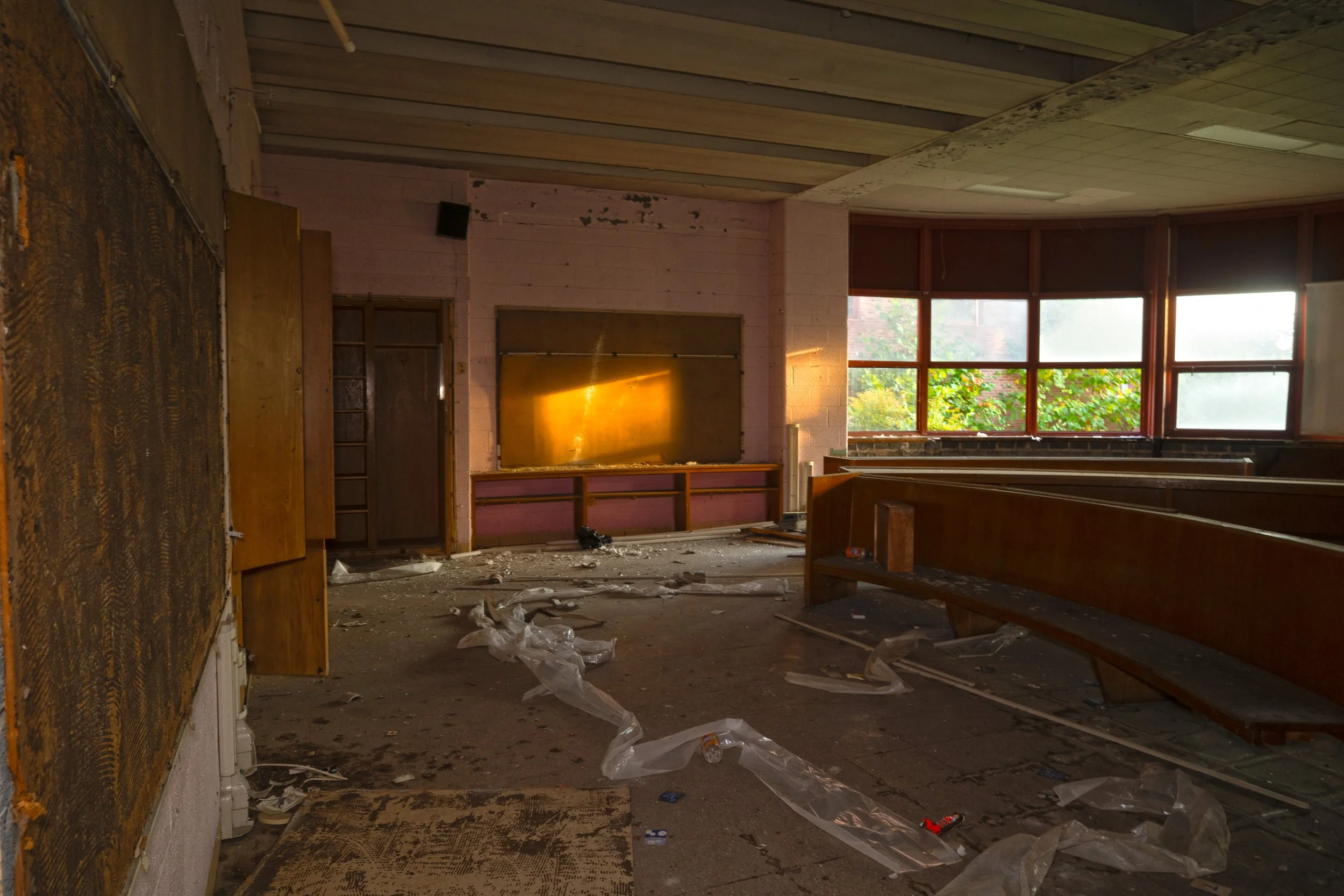 Bunche was a very unique twist of CMU, while many Detroit schools built in the 1950s or with additions in the 50s have boring painted concrete brick designs. Bunche somehow puts a interesting twist into its architectural style. From the curves to the layout of the school it is very unique, also of note is the inclusion of two separate kindergarten rooms both completed with bay windows. Bunche will also be remembered by me for its abundance of papers and textbooks just laid all over the floor everywhere. Along with this the one school in Detroit I have seen with a library still having books or other media inside, the other thing of note would be the desks still semi lined up in many classrooms.