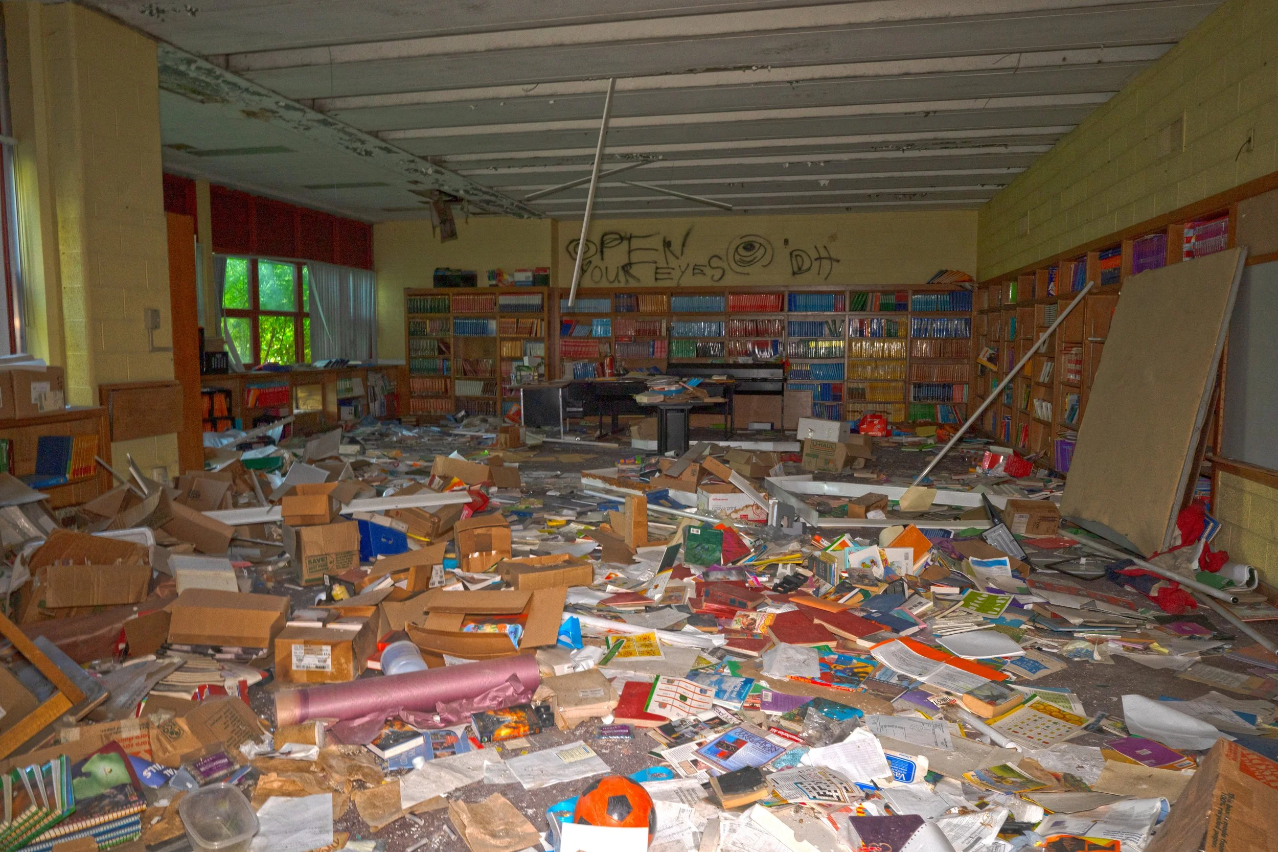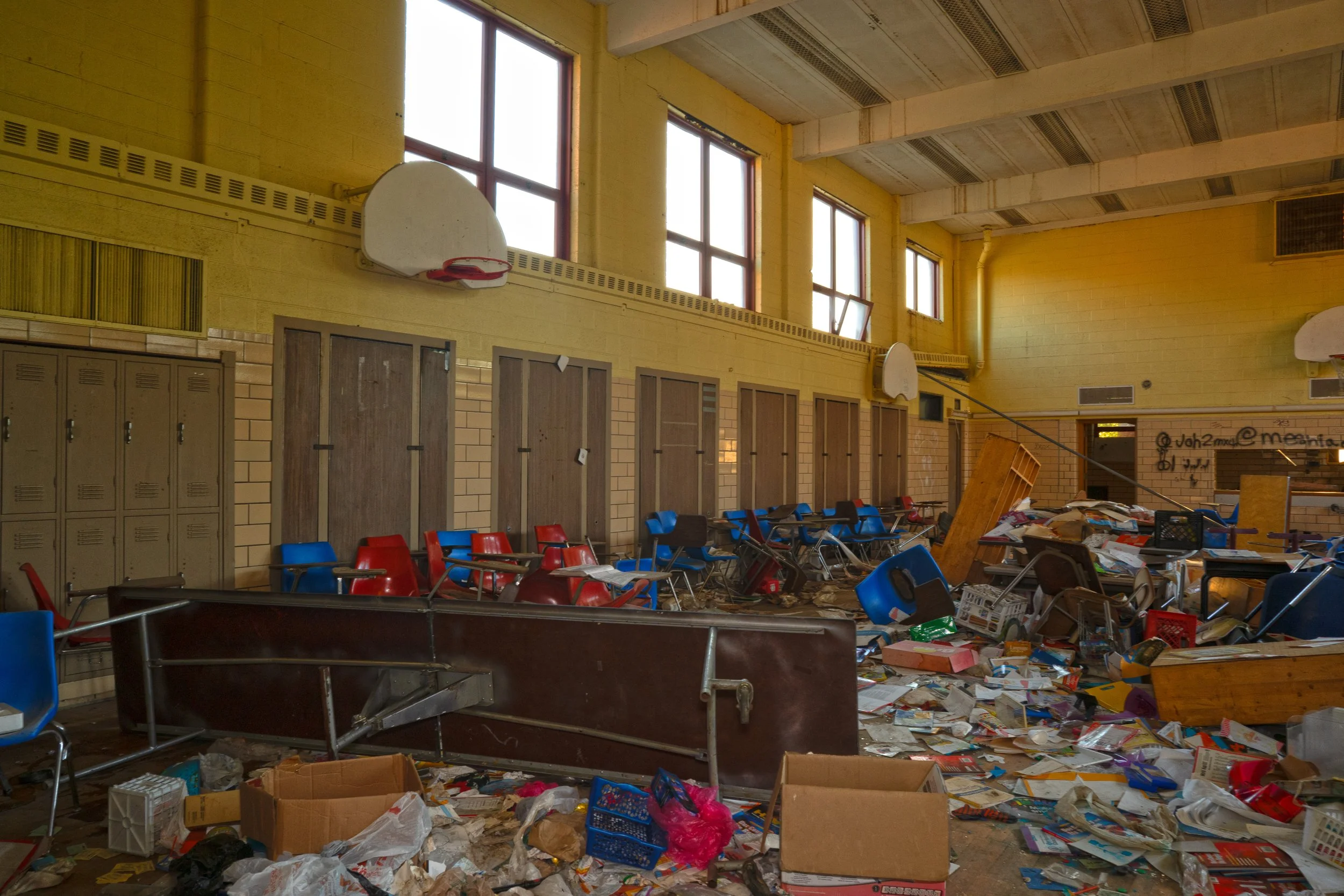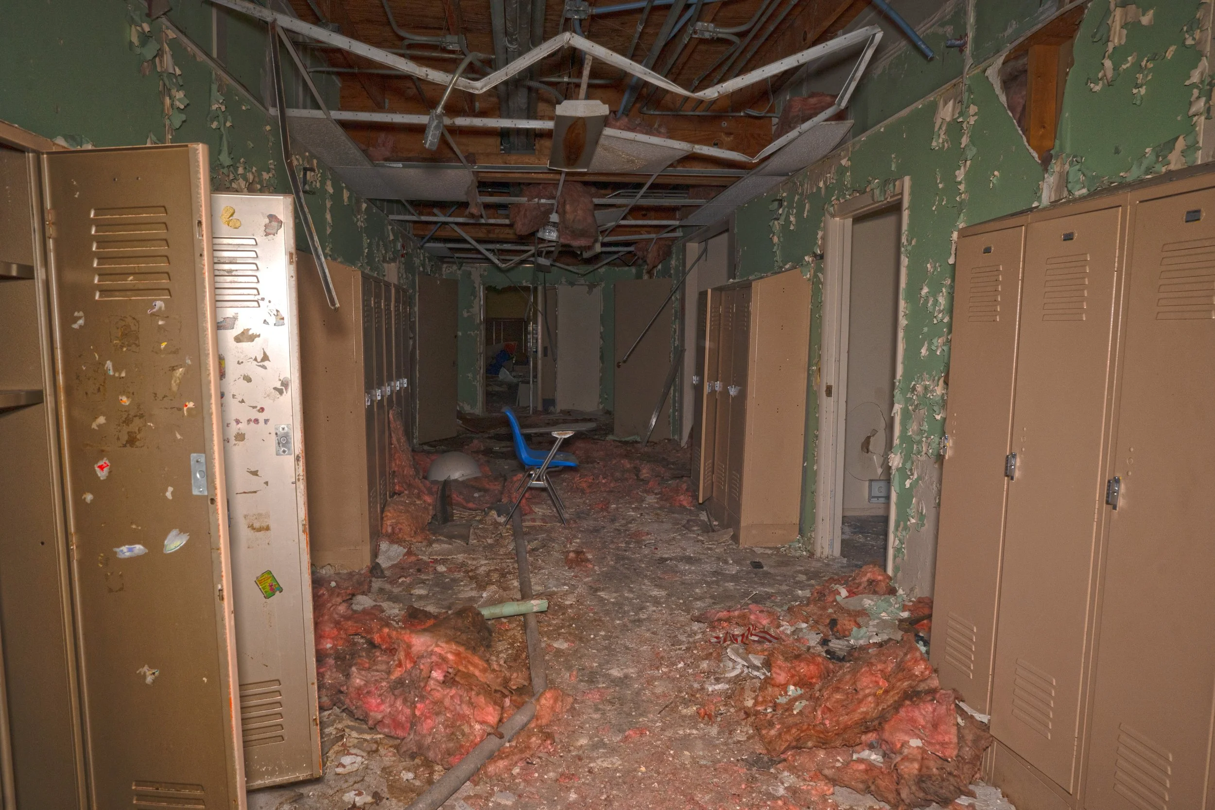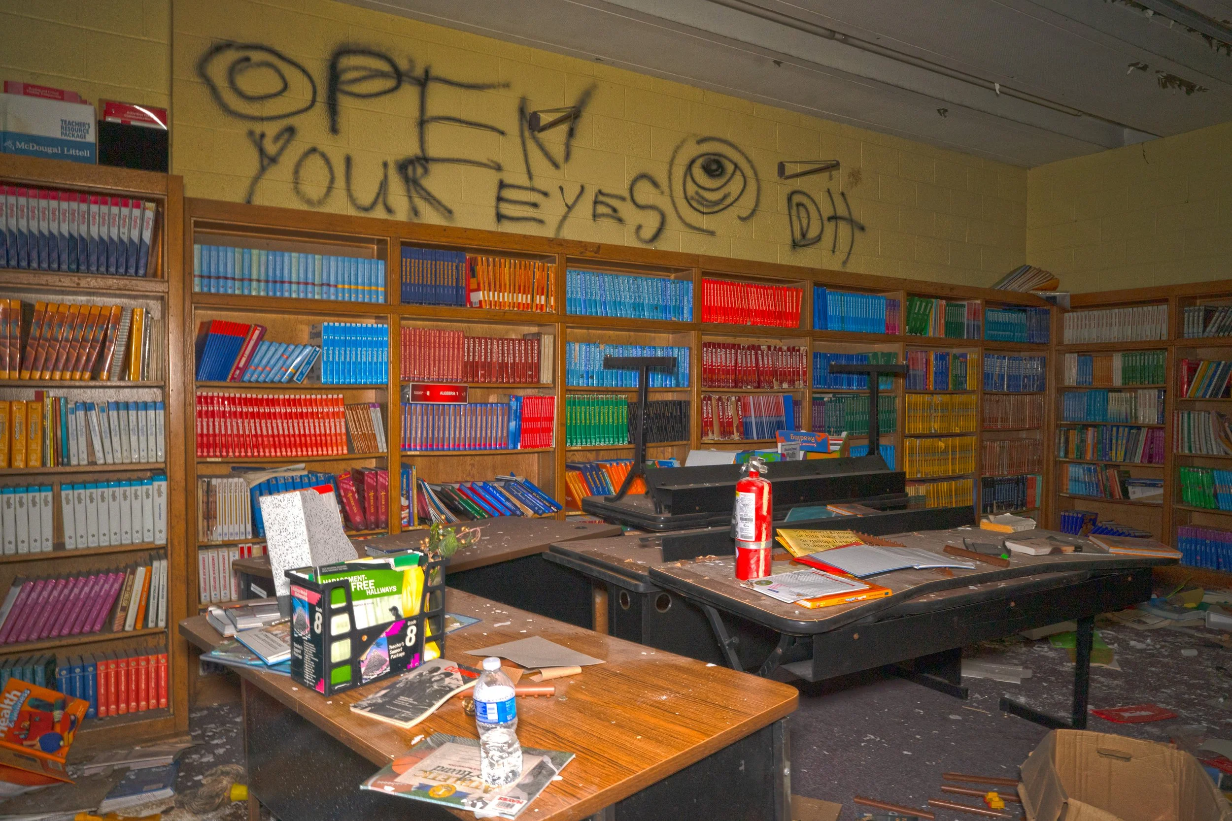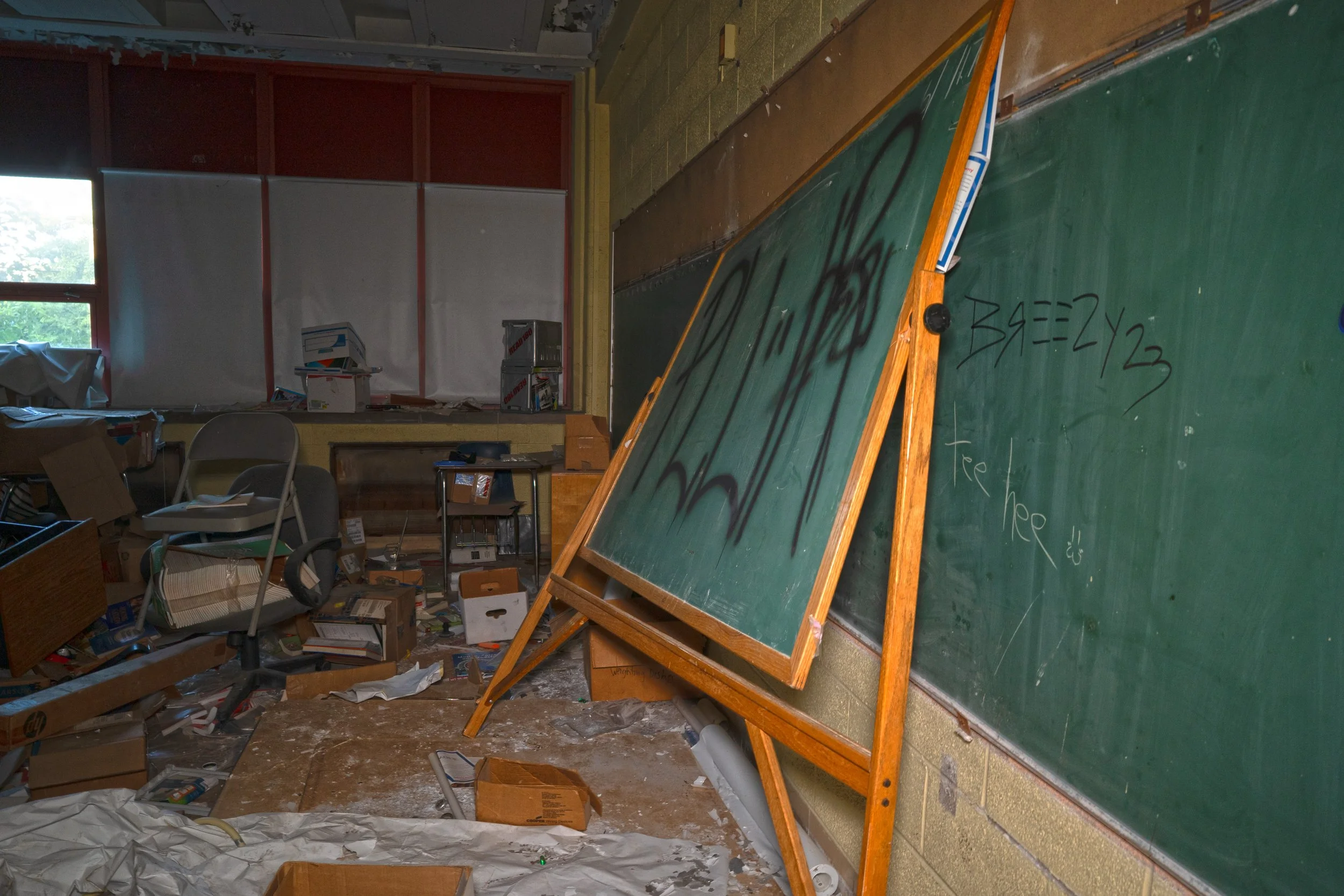Bunche was a very unique twist of CMU, while many Detroit schools built in the 1950s or with additions in the 50s have boring painted concrete brick designs. Bunche somehow puts a interesting twist into its architectural style. From the curves to the layout of the school it is very unique, also of note is the inclusion of two separate kindergarten rooms both completed with bay windows. Bunche will also be remembered by me for its abundance of papers and textbooks just laid all over the floor everywhere. Along with this the one school in Detroit I have seen with a library still having books or other media inside, the other thing of note would be the desks still semi lined up in many classrooms.